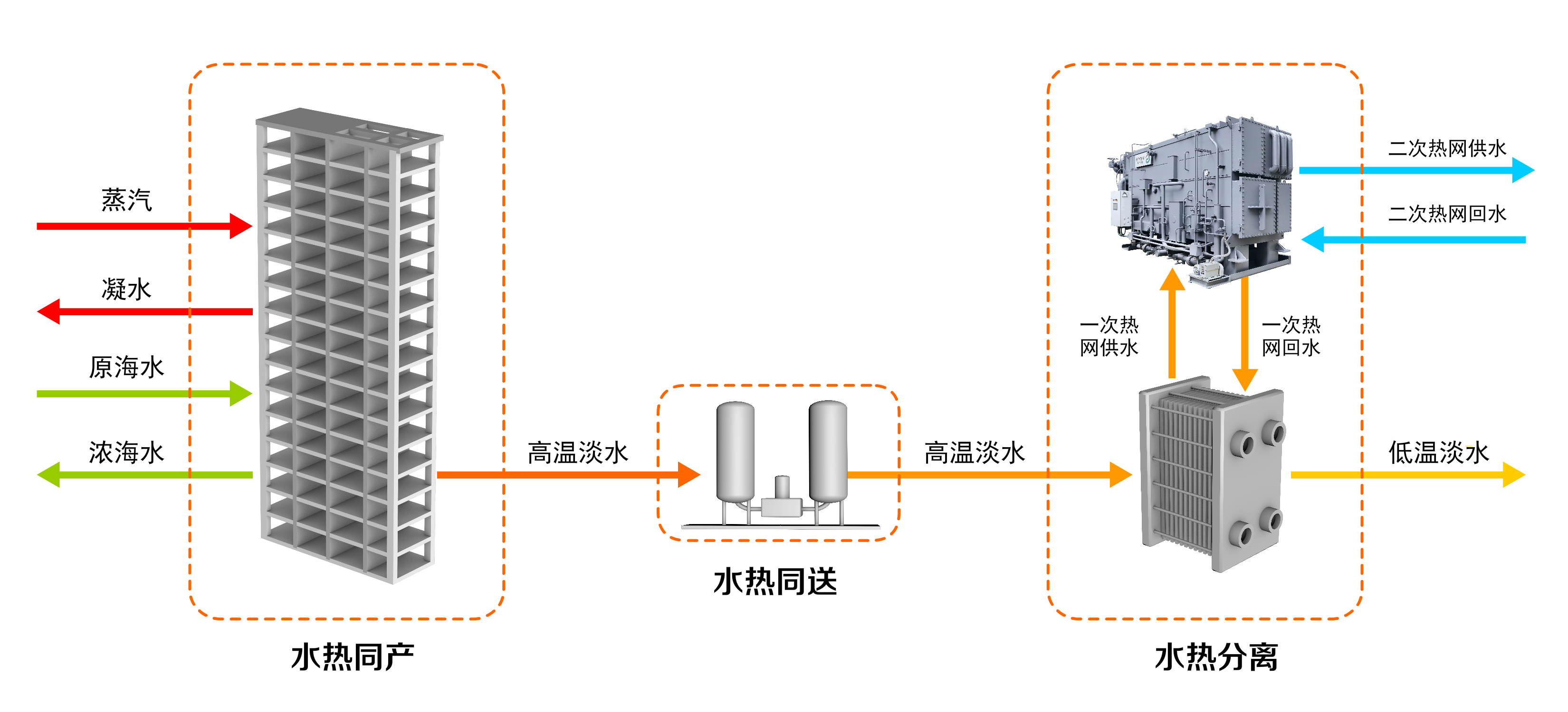 3、換熱站內通過水熱分離設備提取熱量,滿足熱用戶的用熱需求,降溫后的淡水滿足部分生活用水需求。