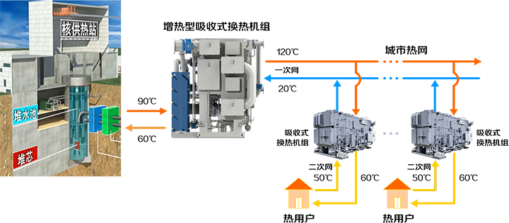 在核供熱首站,設置增熱型吸收式換熱機組將一次網水的供水溫度由90℃提高至120℃,輸送至城市換熱站,在保證二次網供熱品質不變的前提下,經吸收式大溫差換熱機組后將一次網水溫降至20℃返回核供熱首站。由于提高了一次網供水溫度,同時降低了一次網回水溫度,從而拉大了供回水溫差,可以大幅減少一次管網初投資費用,降低核供熱系統投資成本和運行成本。
